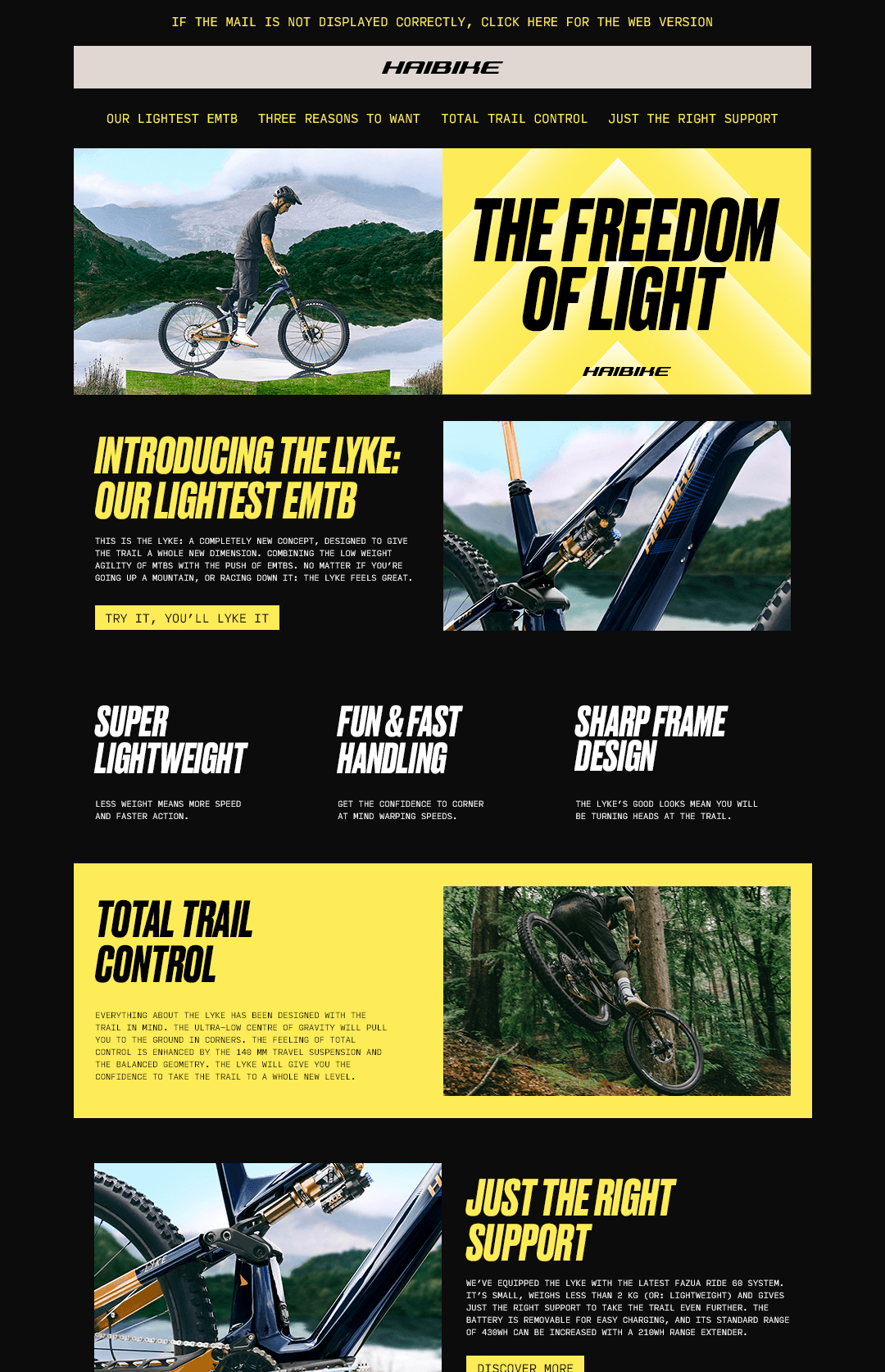 De grote kracht van de LYKE is z’n lage gewicht. Het is de lichtste elektrische mountainbike die Haibike ooit heeft gemaakt. Laag gewicht betekent vrijheid: scherper door bochten, sneller op klimmen, meer controle in de afdaling. De zin “The Freedom of Light” vat dit gevoel mooi samen en was het vertrekpunt van een lanceringscampagne die volledig draaide om vrijheid. In de film zien we professionele MTB’er Kevin Broda met de LYKE fietsen. We spelen met perspectief, spiegeling en cameravoering waardoor de fiets lijkt te vliegen en de kijker niet meer weet wat boven en onder is.